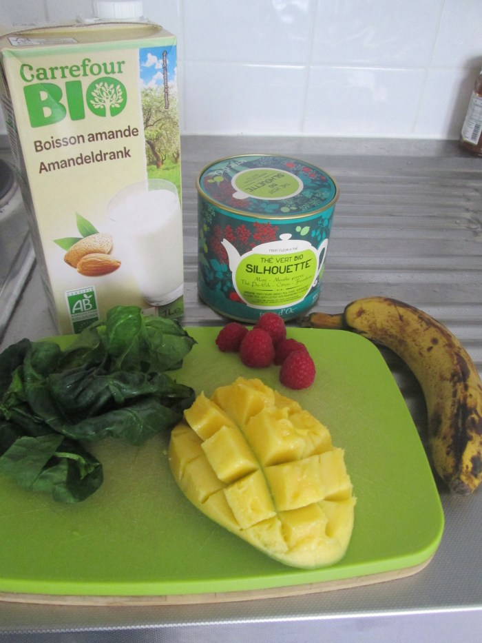 Quelques épinards frais bio, des framboises et une demi-mangue sauvage bio aussi, une banane récupérée dans vos invendus, du lait végétal, le tout dans un mixeur, accompagné d'un bon thé vert. Et voilà, vous avez la recette du bonheur terrestre! 🙂